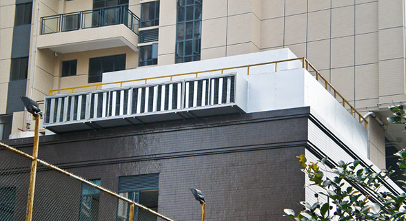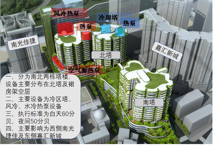 1)治理设备:17楼屋面(2组冷却塔、2台热泵、3台水泵、4台油烟风机)、20楼屋面(3台热泵、4台水泵、6台空气源热泵)、7楼架空层(24台空气源热泵)和1~4楼裙楼(8个AHU空调机房)